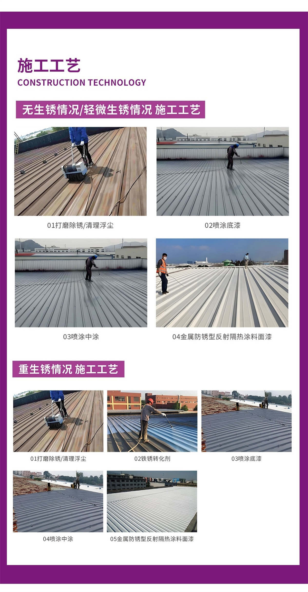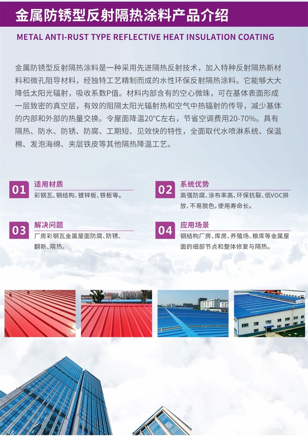 3、解決問題:廠房彩鋼瓦金屬屋面防腐、防銹、翻新、隔熱。