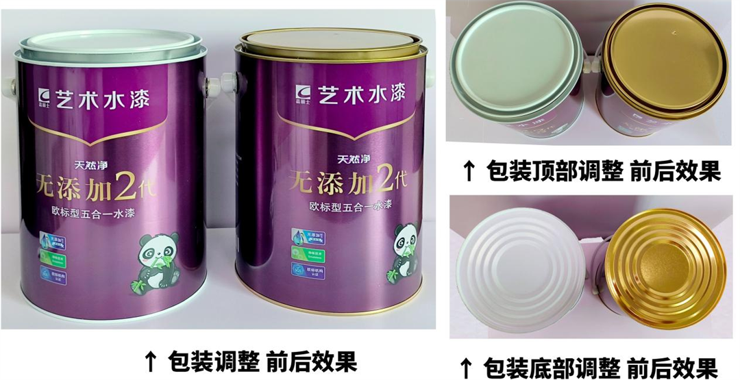 為進(jìn)一步提升5L內(nèi)墻乳膠漆包裝質(zhì)量,改善市場反饋的環(huán)口生銹問題,公司經(jīng)過近幾個(gè)月的產(chǎn)品熱儲(chǔ)、破壞性測試、竟品對標(biāo)分析及與供應(yīng)商的深入討論,于2025年4月22日起將5L乳膠漆包裝罐的底座、環(huán)口、桶蓋顏色由白色調(diào)整為金色。