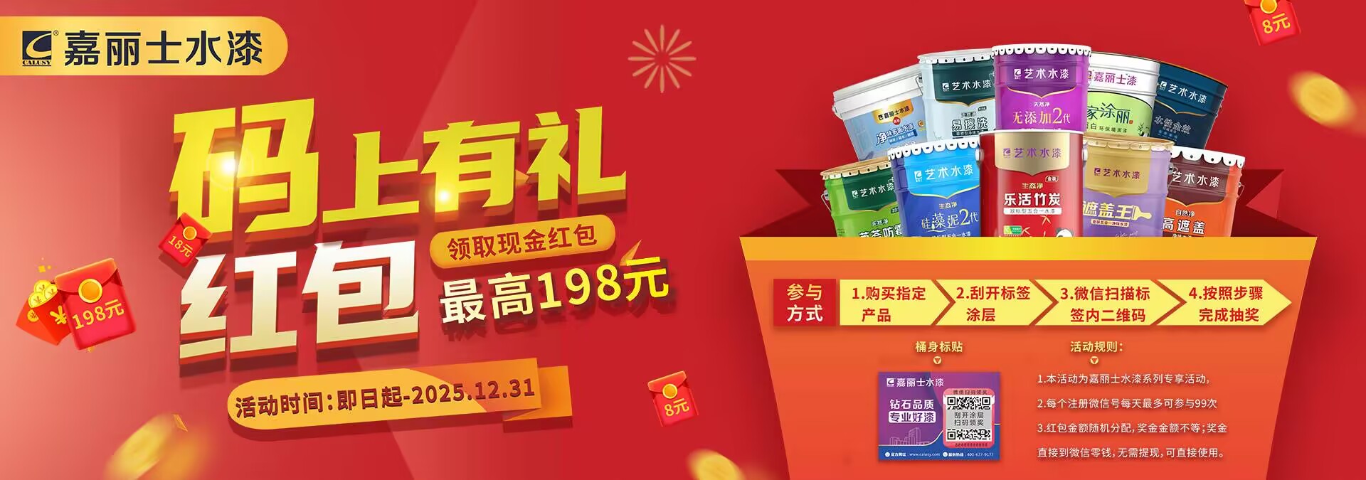 嘉麗士水漆 推出 “碼上有禮” 紅包活動,最高可領(lǐng)198元!不管是1.8 元、5.8元,38元,還是超級幸運(yùn)的198 元,每一個紅包都是嘉麗士水漆對大家的誠意與回饋。