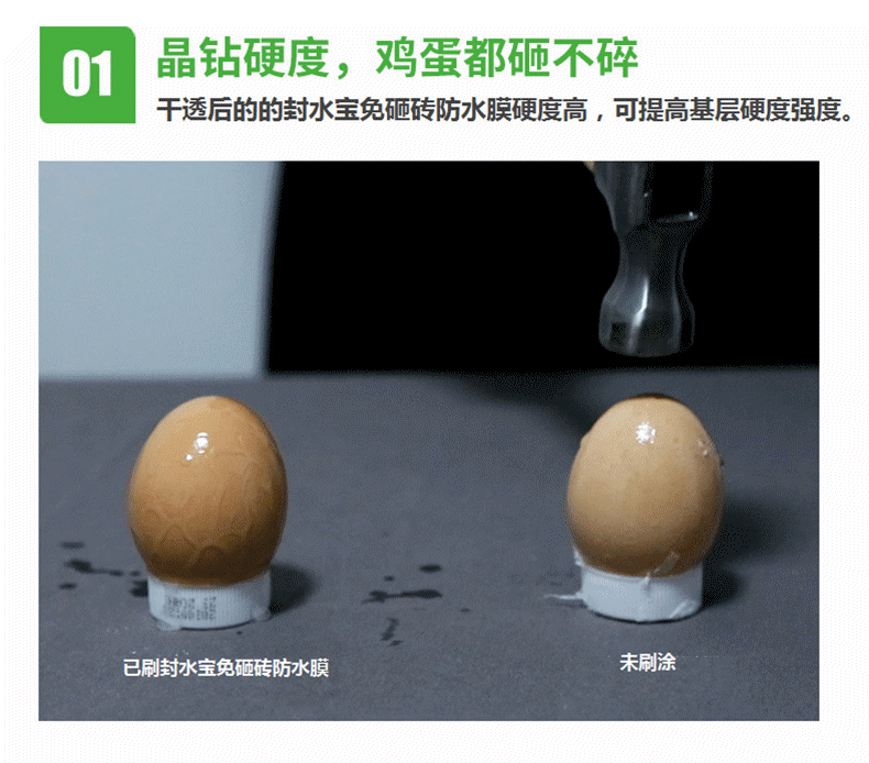 封水寶免砸磚強效耐候防水膜,是以優(yōu)質(zhì)天冬聚脲樹脂、精選助劑、顏填料、固化劑為改性異氰酸脂組成的雙組份產(chǎn)品,混合后產(chǎn)生交聯(lián)反應(yīng)形成高分子透明防水膜,適用于屋頂,水池、廚房、衛(wèi)生間瓷磚表面滲水修復、內(nèi)墻表面防水防潮處理,讓你重做防水不砸磚,省時、省工更省錢。