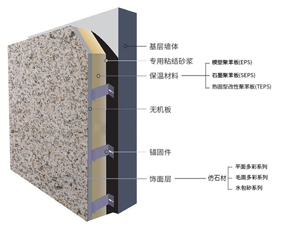 無(wú)機(jī)板類(lèi)多彩仿石保溫裝飾一體板選用高密度、高強(qiáng)度A1級(jí)無(wú)機(jī)板為基材,通過(guò)精砂、滲透封閉、界面處理、飾面噴涂(輥涂)、固化、養(yǎng)護(hù)、復(fù)合等多道現(xiàn)代化生產(chǎn)工序加工成型。